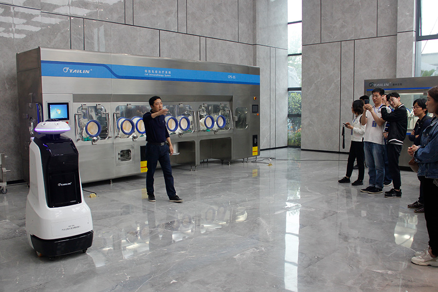九体育副总经理夏信群向各位领导、专家们介绍正在自动行走的灭菌机器人,以及应用于CAR-T细胞治疗的细胞治疗工作站。